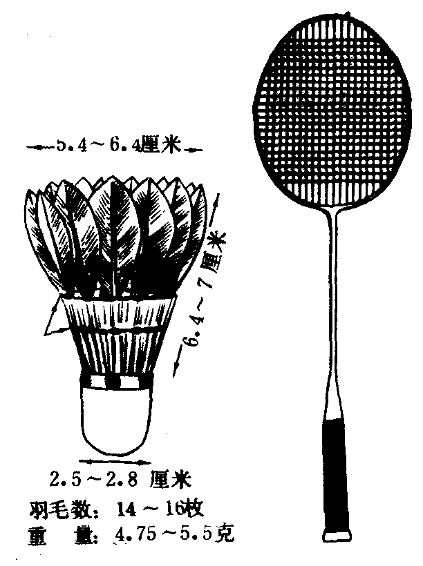 | 释义 | 球和球拍羽毛球是用14~16根羽毛插在半球形的软木托上制成。软木托直径为25~28毫米,托外包有白色薄皮革或类似材料。托面至羽毛尖长64~70毫米,羽毛上端围成圆形,直径为58~68毫米。在托上1.25和2厘米处用线将羽毛编结牢固。球重量为4.74~5.50克。羽毛球拍是用木、铝合金或碳素纤维等材料制成,质轻而坚实,并富有弹性。拍框中间用羊肠线或尼龙线经纬相错编织成拍面。球拍重量为90~120克(不包括线的重量)。球拍框为椭圆形,长为25~25.5厘米,宽为20~20.5厘米。球拍的握柄长为39.5~40厘米。手握处的直径最多不得超过2.8厘米。(见图2—3—24)
