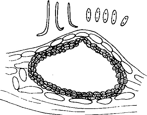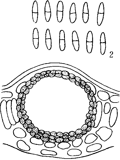 壳多孢属[Stagonospora (Sacc.) Sacc.] 分生孢子器散生,常排列成点线状,埋生、球形,黑褐色,单腔,厚壁,孔口圆形,单个,偶呈乳突状;分生孢子梗缺;产孢细胞无色,桶形,全壁芽生式产孢,偶作环痕式延伸一次;分生孢子无色,光滑,圆柱形或梭形,具数个真隔膜,无缢缩或有,直或微弯,常有多数小油球,基部近平截。分布较广,已描述200余种,中国报道14种。引起植物叶斑病。常见种有引起雀麦紫斑病的雀麦壳多孢(S. bromi Smith et Ramsb.)。 球壳孢目Sphaeropsidales半知菌亚门,腔孢纲。菌丝有隔膜,淡色至暗色。菌丝体繁茂,产生分生孢子器,有的可形成子座或菌核。分生孢子器有近球形、半球形、盾形或瓶形等,有或无突起或短喙,孔口小而圆,有的具纵长裂口或无孔口,器壁为拟薄壁组织,膜质、革质、炭质或肉质等,淡色至暗色(或鲜色),单腔或多腔,表生或埋生,散生或聚生。分生孢子梗从分生孢子器内壁细胞上生出,常单枝,多而短小,紧密排列,少数较细长,常无隔膜,无色,端部产孢细胞内壁芽生,瓶体式产孢或全壁芽生产孢,环痕式或合轴式延伸。分生孢子为卵圆形、椭圆形、纺锤形和线形等,单胞、双胞、多胞或砖格孢,无色至暗色,单生,常聚集在分生孢子器内的胶质中。有性态为子囊菌。陆生,寄生或腐生,营寄生的种类引致植物叶斑、枝枯、皮腐和果腐等症状。本目有球壳孢科和鲜壳孢科等4科,含茎点霉属、色二孢属、壳针孢属和大茎点菌属等700余属。 |