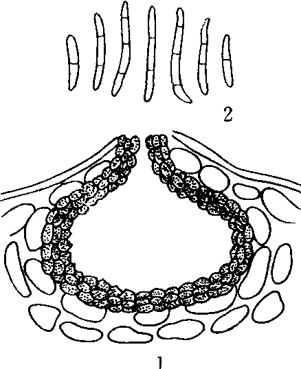 拟茎点霉属[Phomopsis(Sacc.) Bubak] 分生孢子器生叶,果实上无明显的子座,在基物或培养基上形成真子座,埋生,褐色至暗褐色,分散,集生或合生、球形、烧瓶形或扁球形单腔、多腔或螺旋状腔,器壁厚,上半部色常略深,孔口单个或数个,圆形或乳突状;分生孢子梗分枝,分隔,无色,多数细长;产孢细胞无色,圆柱状,内壁芽生瓶体式产孢;分生孢子有二型: a孢子无色,单胞,纺锤形,直,通常含有2个油球; β孢子无色,单胞,线形,不含油球,一端常为沟状(图2)。有性态属于间座壳属(Diaporthe)。本属多寄生叶或果实引起叶斑或果腐。已描述400余种。中国报道12种。常见种有引起茄褐纹病的茄褐纹拟茎点霉[P.vexans(Sacc.et Syd.)Harter]和引起苹果、梨、李、樱桃等果腐病和干腐病的苹果拟茎点霉(P.mali Roberts)。