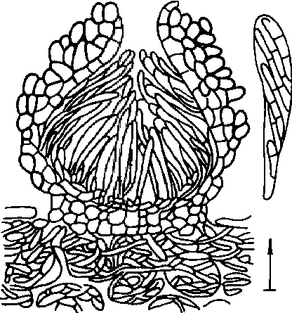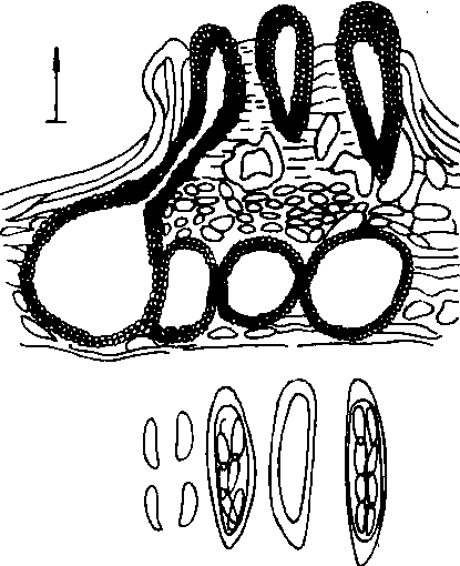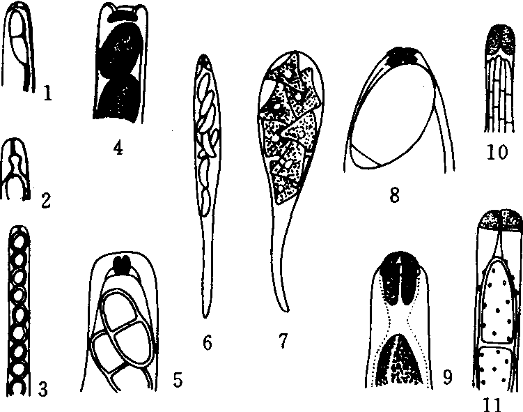 图4 虫草(冬虫夏草)的虫体及子座(仿邓叔群) 座坚壳属(Rosellinia de Not.) 子囊壳球形,黑色,生于基物表面,硬而脆,常被菌丝层包围;子囊圆筒形,无色,内含8个子囊孢子;子囊孢子椭圆形或棱形,单胞,黑色或深褐色,具发芽缝。无性阶段属粘囊孢属(Graphium)。大多腐生,少数寄生。本属已报道的约100种,中国报道20种,常见种有:褐座坚壳[Rnecatrix (Hart.) Berl.],无性态为自纹羽束丝菌,寄生于苹果、梨、桃、李、杏、葡萄、马铃薯、蚕豆、大豆、芋、桑、茶等植物根部,引起白纹羽病。 炭角菌属(Xylaria Hill ex Schrenk) 子座直立,坚实,大形,分枝或不分枝,黑色,基部不育;子囊壳球形,埋生子座内;子囊圆筒形;内含8个子囊孢子,有侧丝;子囊孢子椭圆形,单胞,黑色。本属是一个大属,已报道约100种,中国报道54种。主要生于腐木和木材上。常见种有果生炭角菌[X.carpophila (Pers.)Fr.],生于枫香的落果上。 囊孢壳属(Physalospora Niessl) 子囊壳球形,黑褐色、具短颈或乳头状孔口,无子座,埋生寄主组织内,后突破寄主表皮露出孔口;子囊棍棒形,内含子囊孢子8个;子囊孢子椭圆形,卵形或纺锤形,单胞、无色或鲜色。本属已报道30种,中国报道14种。常见种有:仁果囊孢壳[P.obtusa (Schw.) Cooke],无性态为果球壳孢(Sphaeropsis malorum),为害苹果、梨、榅桲等引起黑腐病。梨囊孢壳(P.piricola Nose),无性态为轮纹大茎点菌(Macrophoma Kawatsukai),寄生于梨、苹果的树皮和果实,引起轮纹病。葡萄囊孢壳(P.baceae Cav.),无性态为肾形茎点霉(Phoma re-niformis),寄生于葡萄引起房枯病。 球壳目Sphaeriales子囊菌亚门,核菌纲。菌丝有隔膜,菌丝体繁茂,淡色至褐色。有性生殖产生的子囊壳球形、半球形或烧瓶形,暗色,膜质、炭质或鲜色肉质,单生或聚生,埋生或表生,有或无子座,壳端部有乳头状孔口或短喙或长喙,孔道内壁上有缘丝。子囊多个,圆筒形,棍棒形或卵圆形,束生、平列或散生,子囊壁单层,顶壁有不同程度加厚和孔口等结构,少数菌的子囊壁早期胶化,子囊间多有侧丝,常早期消解。子囊孢子8个,形状多种,单胞、双胞或多胞,无色至暗色。无性繁殖时形成的分生孢子多样式,常大量发生。陆生,腐生或寄生,营寄生的种类引致叶枯、枝枯、果腐和赤霉等症状。本目有疔座霉科、肉座菌科和间座菌科等15科,含小丛壳属、赤霉属和黑腐皮壳属等200余属。 |