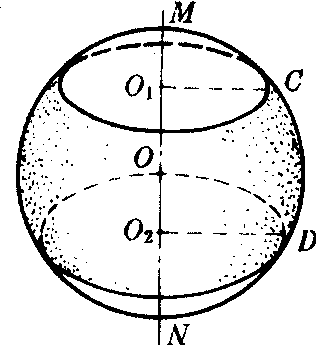 球面被两个平行平面所截,夹在两个截面之间的球面的一部分.截得的两个圆叫做球带的底;两个平行平面之间的距离叫做球带的高.