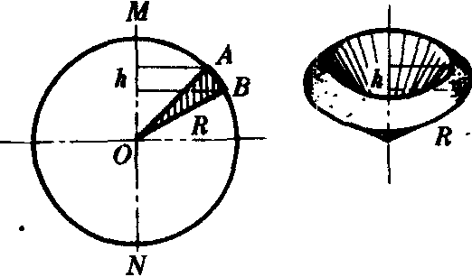 | 释义 | 球扇形qiushanxing半圆内的一个扇形(如图1,图2中的AOB),绕着半圆的直径MN旋转一周得到的几何体.由这扇形的弧旋转一周得到的面(球冠或球带)叫做球扇形的底;这里球冠、球带的高也叫做球扇形的高.