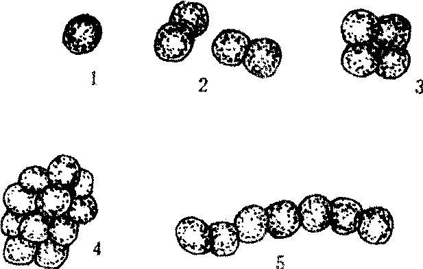 | 释义 | 球菌qiujun细胞形状为球形的细菌的总称。其中有的单生,如尿素小球菌,常称之为单球菌;有的为2个细胞连在一起,叫双球菌,如肺炎双球菌;有的为多个细胞连成链状,叫链球菌,如乳酸链球菌;还有的4个细胞连在一起,叫四联球菌;8个细胞叠垒一起的为八叠球菌;还有的是许多球形细胞集在一起成葡萄状,叫葡萄球菌,如金黄色葡萄球菌等。