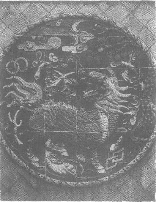 | 释义 | 琉璃影壁方心清道光。坛径2.4米,麒麟高1.8米。山西省介休县后土庙门前影壁背面。琉璃是用于建筑艺术装饰的一种陶器。以陶土作胎,施以含氧化铅的琉璃釉,多数为二次烧成。战国时期已出现琉璃工艺,六朝时已将琉璃用于建筑。山西琉璃自北魏以来享有盛名,在寺院中有不少琉璃遗存。介休县的后土庙建造年代不详,历经几毁几修,现存殿堂多为明、清所建。寺庙建筑全部饰以琉璃瓦件,多为清嘉庆、道光年间作品。此门前影壁的圆坛方心,内塑麒麟望月。麒麟体肥壮,怒目圆睁,口大张。身体施绿釉,鬃毛、尾、蹄以黄釉装饰。周围有菩提树、流云、法螺等法器。装饰繁缛,色彩对比强烈,是清代琉璃饰件的珍品。“麒麟”是古代传说中的动物,作为吉祥的象征。