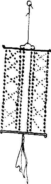 将红、绿、蓝等不同颜色的琉璃珠子串在一起,组成各种图形,下缀一块红布,作为此行业的标记。