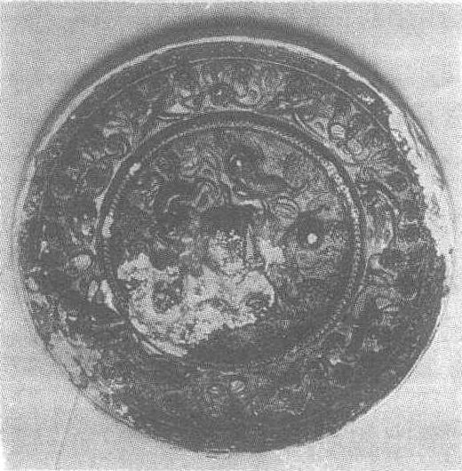 | 释义 | 瑞兽葡萄纹铜镜唐。直径12.2厘米,厚1.5厘米。1974年广东省始县赤土岭54号墓出土。广东省始县博物馆藏。铜镜圆形,体质厚重,镜面微弧,背面中央有蟾蜍形钮,圆形钮座外饰伏卧昂首的瑞兽,兽间有葡萄蔓枝叶实,其枝叶伸展到外区,其柔长的枝条,舒展的花叶,丰硕的果实与生动活泼的瑞兽,纷飞的凤鸟构成了一幅具有魅力的图案。镜缘宽平。整个铜镜的纹饰精细,形态生动,具有很高的工艺欣赏价值。
