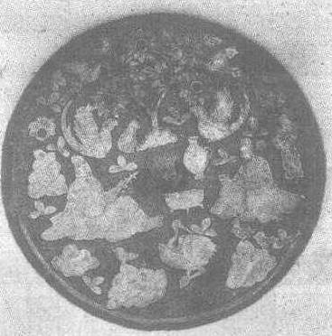 唐代制品,现藏台北故宫博物院。直径13.3厘米、边厚1.1厘米、重630克,作八瓣菱花形。镜背漆黑色,钮做伏狮形。主纹为花枝间的双兽双凤,镜缘饰花草鸟蝶。图案为浮雕式,花纹精细清晰。瑞兽鸾鸟纹镜是盛唐时流行的铜镜类型。