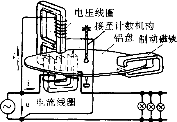 | 释义 | 瓦时计washiji累计电能的电表。又称电度表或电能表,俗称火表。测量直流电能时采用电动式瓦时计,测量交流电能时采用感应式瓦时计。交流瓦时计又可分为单相和三相两类。照明用电路一般使用单相瓦时计,动力电路一般使用三相瓦时计。感应式瓦时计的基本结构如图所示。其主要部分由两个电磁线圈、一个铝盘和一个制动磁铁组成。电压线圈的匝数很多,导线很细,线圈与负载并联,承受全部电源电压;电流线圈匝数很少,导线很粗,线圈与负载串联,通过全部的负载电流。铝盘可绕转轴转动,是瓦时计的可动部分,它的主要作用有二:❶电压线圈及电流线圈分别产生正比于电压U和电流i的交变磁通,这些磁通穿过铝盘时,使铝盘感应出涡流,由于磁场对涡流的作用,使铝盘得到一个与有功功率P成正比的转矩;