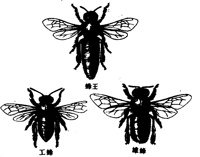 图1 中华蜜蜂 生物学特性 在自然界中,中蜂群常在树洞、阳坡土洞、坟窟、谷仓、墙洞中营造蜂窝,巢脾数量一般10张以上。脾的形状随周围的形状、环境而改变:如在宽阔的谷仓中营巢,巢脾呈扁狭长形,宽度可达100厘米以上,而垂直高度只有30厘米;在直立的空心树干中的营巢,巢脾呈长条形,高度可达100厘米以上,而宽度只有20~30厘米。巢脾平均总面积为17 102平方厘米,房孔数5万~7万个。工蜂房内径4.40~5.00毫米,雄蜂房内径5.10~5.70毫米,王台内径8.5~10.2毫米。组成蜂群的工蜂、雄蜂、蜂王3种个体的发育所需要天数见表。 中华蜜蜂个体发育表