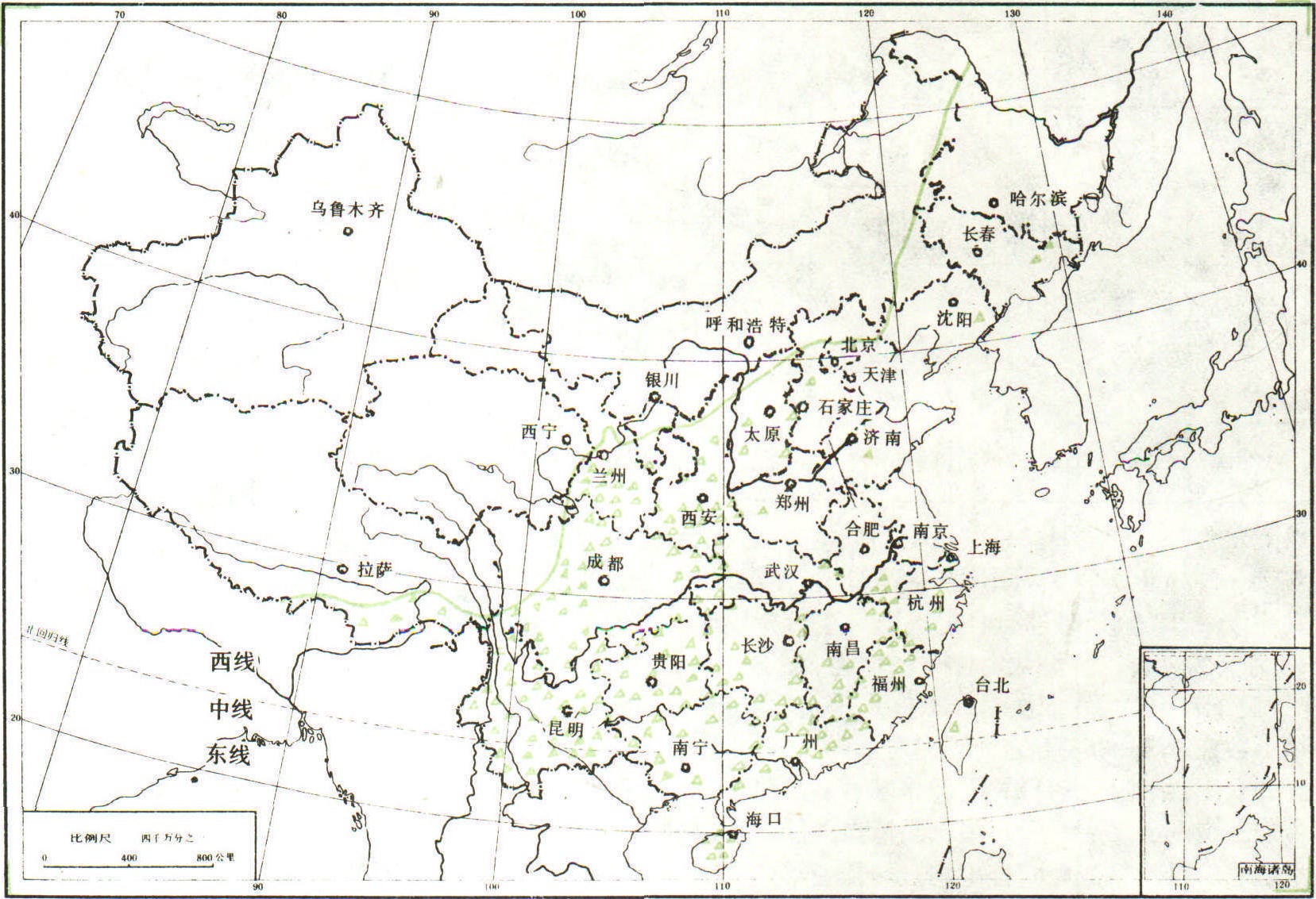 图2 中华蜜蜂在中国的分布图 中华蜜蜂Chinese beeApis cerana cerana Fabri-cius,简称中蜂。东方蜜蜂的一个亚种。分布在除新疆以外的中国各省区,主要集中在长江流域和华南各省山区。在不同生态条件下存在的主要类型有:东部中蜂、海南中蜂和阿坝中蜂。蜂王有黑色和棕色两种,体长14~19 mm。雄蜂黑色,绒毛灰色,雄蜂蛹房房盖中央有小气孔。工蜂后翅中脉末端分叉。喙长4.5~5.6 mm。在巢门口扇风时头部朝外,腹部朝向巢门。工蜂体色变化较大。生活在高纬度或高海拔山区者,腹部背、腹板偏黑色,生活在低纬度、低山和平原区者则偏黄色。除部分被人工饲养于蜂箱外,野生中蜂多在阳坡干燥地段的土洞、坟洞、树洞或墙洞中营巢,巢脾的形状和大小随所处空间状况而改变。蜂王、工蜂和雄蜂的个体发育期分别为16天、19天和22天。抗寒耐热,抗蜂螨能力强,能躲避胡蜂和蜻蜓等敌害的捕杀。泌蜡力强,易受大小蜡螟幼虫的危害。分蜂性强,一般能维持1.5~3.5 kg的群势。嗅觉灵敏,善于利用零星蜜源,采集勤奋,适于广大山区定地饲养,是中国优良的蜂种资源之一。 |