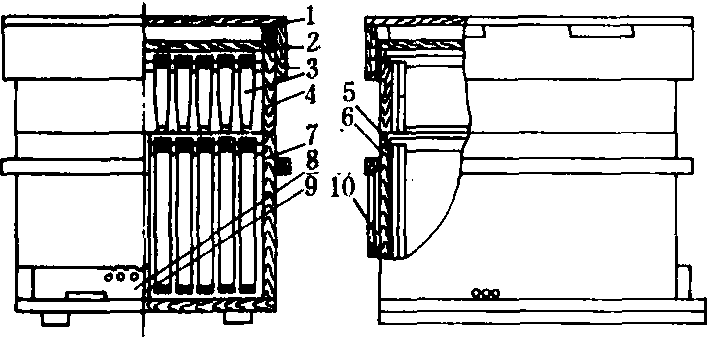 1.箱盖;2.副盖;3.浅继箱巢框;4.浅继箱;5.铁压条; 6.巢箱; 7.巢箱巢框; 8.巢门板;9.巢箱隔板;10.纱窗拉门