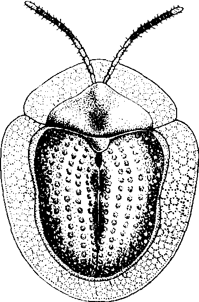 中国中南部甘薯产区年发生4~6代,以成虫在枯叶,杂草、土缝或石隙中越冬。翌年春回暖后爬出活动,先在薯苗繁育地里生息、繁殖,后侵入大田,天气闷热气温达25~30℃时能迅速飞翔。成虫有假死性,羽化一周后,开始交配产卵。卵散生在叶背的叶脉旁,每次产4~25粒,卵多2粒并排于卵鞘中。幼虫共5龄,孵化后1~2日开始取食,3龄以后活动性强,老熟后便粘附叶背化蛹。清洁田园,可消灭大部越冬成虫;虫量多时,喷施乐果、敌百虫、拟除虫菊酯类农药防治。 甘薯台龟甲ipomoea tortoise beetleTaiwania cir-cumdata (Herbst),又称甘薯小龟甲和甘薯绿龟甲。昆虫纲,鞘翅目.龟甲科。分布于浙江、福建、广东、广西。寄主有甘薯、蕹菜等旋花科植物。成虫体长4~5mm、扁椭圆形,背面隆起,腹面平坦,金绿色,有金属光泽;前胸背板及鞘翅周缘无色透明,具网状纹;鞘翅上的黑色或褐黄色纹左右相连接,形成“U”字形,其中间有一小“Y”形纹。末龄幼虫体长约5 mm,淡绿色,长椭圆形,体背具中隆线,体侧每边有棘刺16枚,具尾刺一对。浙江一年发生3~4代,广东5~6代,以成虫在杂草、土缝里越冬。成虫有假死性,食叶成缺刻或孔洞,卵多2粒并排散产于叶柄、叶脉附近或分叉处。初孵幼虫仅食表皮和绿色组织,3龄后食叶成孔洞或缺刻,老熟后以胶质将尾部黏附在叶背上化蛹。清洁田园可减少虫源;在成虫盛发时喷洒农药毒杀。 |
