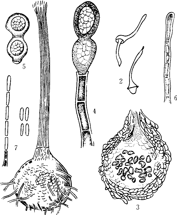 病菌在培养基上的生长温度,最低为9~10℃,最高为34.5~36℃,最适为25~30℃。病菌接种于薯块,14℃时易生厚垣孢子,23℃则易产生子囊壳。生长的pH范围为3.7~9.2,最适为6.6。培养基中加入低浓度的维生素B1,有助于生长和促进子囊壳的产生。三种孢子如在薯块伤损处或1%蔗糖液中,萌发率较高。 甘薯黑斑病发生轻重与温湿度、土质、耕作制度、甘薯品种和薯块伤口、虫鼠为害状况等有密切关系。甘薯受病菌侵染后,土温在15~30℃之间均能发病,最适温度为25℃。甘薯贮藏期间,最适发病温度为23~27℃,10~14℃较轻,15℃以上有利于发病,35℃抑制发病。土壤含水量在14%~60%时,病害随湿度的增高而加重,超过60%,又随湿度的增加而递减。一般地势低洼、土质粘重的地块发病重,地势高燥、土质疏松的发病轻。连作田的甘薯发病较重,春薯发病比夏、秋薯重,薯块裂口多或虫、鼠为害有伤口的薯块,病害也相应加重。目前甘薯对黑斑病尚无免疫品种,但品种间抗病性有差异,薯块易发生裂口的或薯皮较薄易破损,伤口愈合速度较慢的品种,发病较重,济薯7号、南京92、华东51、夹沟大紫、烟薯6号等品种(系),抗病性较强。 甘薯黑斑病菌在自然情况下的主要寄主为甘薯,人工接种能侵染月光花、牵牛花、绿豆、豇豆、四季豆、大豆、橡胶树、椰子、可可和菠萝等植物。 侵染过程和病害循环 病菌以厚垣孢子、子囊孢子或菌丝体在薯块或茎蔓上越冬。据测定在室温5℃以上干燥条件下,厚垣孢子和子囊孢子均可存活150天,在水中,子囊孢子可存活148天,厚垣孢子可达128天。病菌在田间土壤内能存活两年零九个月。病害传播途径,即种薯种苗、土壤肥料和人畜携带。利用带病种薯育苗,在苗床上即产生病苗,病苗又侵染健苗,病苗栽植田间后,进而污染土壤。用病土育苗、垫圈,均可造成苗床和肥料带菌传病。土壤带菌主要来自病残体和带菌肥料。在甘薯收获、贮藏时,病菌可藉人畜、昆虫、田鼠和农具等媒介传播,主要从薯块的伤口、裂口、根眼侵人。 病害控制 根据甘薯黑斑病发生的特点,实行以农业防治为主、药剂防治为辅的综合防治措施。❶严格执行检疫制度。严禁从病区调运种薯种苗。 ❷建立无病留种田,培育无病种薯。 ❸选用无病壮苗栽插。可采用温汤浸种、药剂浸种、浸苗或用高温育苗方法,培育无病壮苗。 ❹加强收获和贮藏期管理。留种薯块应适时收获,严防霜冻,并精选入窖,避免破伤。种薯入窖后,即进行高温处理(35~37℃)4昼夜,相对湿度保持90%,以促进伤口愈合,防止病菌的感染。 甘薯黑斑病由甘薯长喙壳菌(Ceratocystis fim-briata)侵染所引起的甘薯苗床和贮藏窖中的重要病害。带有病菌的块根上床后,多在幼苗茎基部的白色部分产生黑色或近圆形的病斑,凹陷,中央部密生黑色刺毛状物(子囊壳)。严重时,幼苗腐烂死亡。苗床迅速再侵染,可使大量幼苗生长不良或死亡,病苗移栽后,除少数重病苗不能缓苗而造成缺株外,一般由于寄主抵抗力的增长在田间不表现明显症状。病菌潜伏在病苗附近土壤中,使成熟的块根受到污染。在贮藏期间由于甘薯抵抗力下降和病菌的迅速繁殖并进行再侵染,块根上先后发生大小不同的病斑,病斑表现出几毫米深的皮层组织变黑、粗糙、略凹陷,并有强烈的苦味症状。若将薯块横切,可见病部薯肉变成青褐色或墨绿色,味苦。防治方法:避免损伤薯块,减少病菌侵入;防止病、伤薯入窖;药剂处理种薯及秧苗,实行高剪苗;控制窖温在10—13℃间。 甘薯黑斑病sweet potato black rot甘薯一种重要的真菌病害。病原菌为子囊菌亚门的甘薯长喙壳(Ceratocystisfimbriata Ell.et Halst.)。薯块上病斑近圆形,黑褐色,中央略凹陷,病斑下薯肉墨绿色,有苦味。病苗茎基部生黑色梭形病斑,严重时种薯和幼茎变黑腐烂。田间病株根系发育不良,叶片发黄脱落。高湿时病部产生灰黑色霉层,其间生有黑色刺毛状物。病害的侵染来源有病种薯、病苗、带菌的土壤和肥料。病菌借水流、农具、鼠类、昆虫、人畜活动等传播。主要从伤口侵入。大田土温或窖内气温在15~35℃之间、高湿有利发病。防治措施:选用无病种薯种苗、采用35℃高温育苗、药剂处理种苗、种薯入窖前进行愈伤处理、安全贮藏、种植抗病品种等。 甘薯黑斑病由甘薯黑斑病菌引起的甘薯病害,又名黑疤病。1937年由日本传入中国。薯块病斑黑褐色、近似圆形。病菌适宜温度23~28.5℃,最低温度9~10℃,最高温度34.5~36℃。相对湿度80%以上易发病。防治主要有培育无病秧苗、培育无病种薯、控制病害传播3种措施。 |