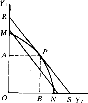| 释义 | 生产可能性曲线production possibility curve又称等资源线。用一定量资源生产两种产品时形成各种可能的产量组合,在坐标图上连接各组合点形成的曲线。设Y1、Y2为两种产品,MN曲线即为生产可能性曲线。这一曲线表示线上任何一点所生产的不同产品数量的组合,其所用资源数量固定不变。同时亦表示在这个条件下两种产品的生产机会。一种产品产量的增加是以牺牲另一种产品的生产机会而获得的,故又称生产机会曲线。在同一生产可能曲线上,获得最大收益的两种产品的组合点是生产可能性曲线和等收益线RS相切的切点P。表明产品Y1的产量为OA,Y2的产量为OB时,能够取得最大收益的产品产量组合点,亦即各种产品边际收益相等之点。