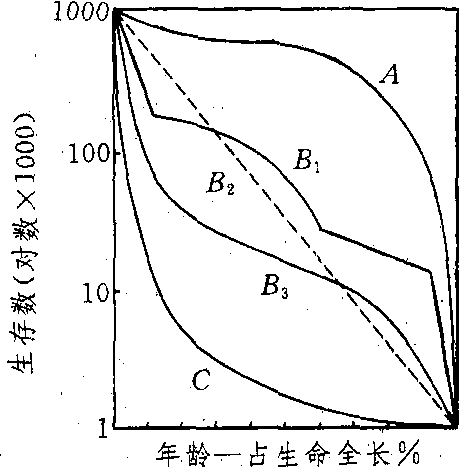 | 释义 | 生存曲线survivorship curve又称存活曲线。种群个体在不同年龄阶段存活率(或存活数)的表达方式。以相对年龄(即以动物平均寿命的百分比表示年龄)作横坐标,存活数的对数值作纵坐标,绘成生存曲线图(见图),用以比较不同寿命的动物,并为建立预测预报模型提供依据。早期学者将曲线类型分为:A型(上凸型),表现为幼期和中期死亡率很小,老年时死亡率激增;C型(下凹型),为幼期死亡率极大;B型(即B2中间型),表现出各时期死亡率相对稳定。1978年美国奥德姆(E.P.Odum)将B型划分为3种,其中B1型呈阶梯式下降,在昆虫中常见,而B3型微凹式多见于鸟、鼠类等。