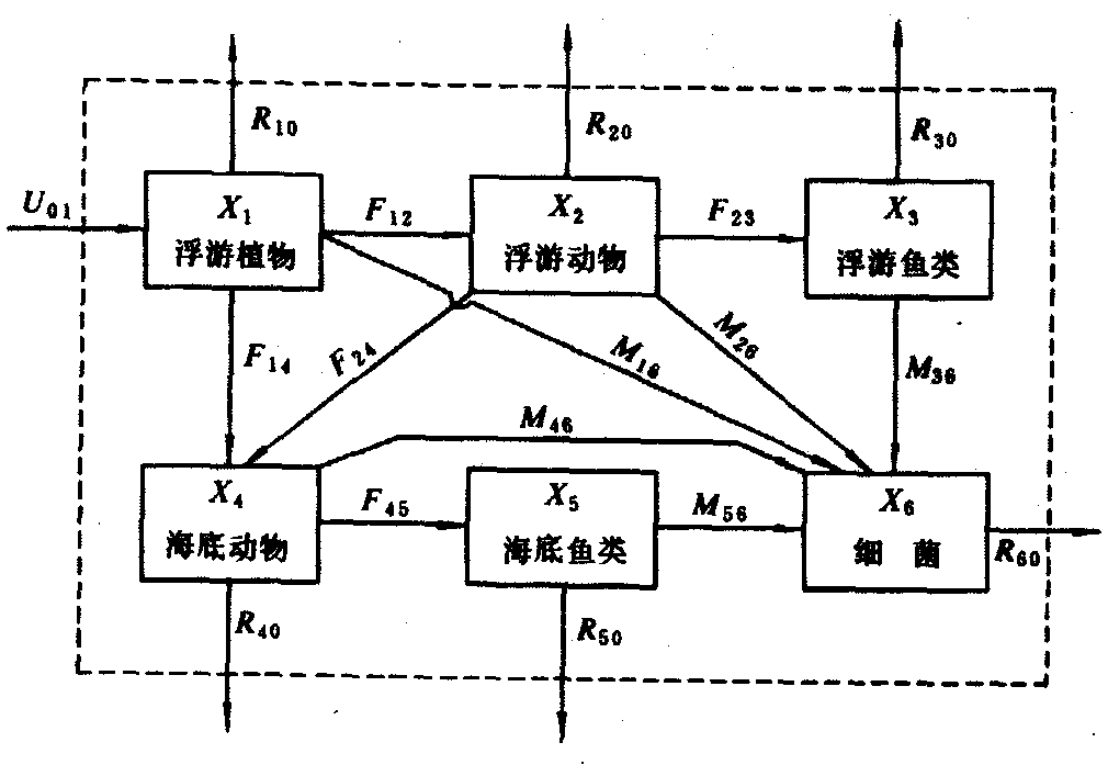 某海洋生态系统能流图 式中 n为设定的最大年龄;Nij为tj时刻生物种群第i年龄组内个体的数量,例如,t1时刻为N1,1、N2,1、Nn,1、t0时刻为N1,0、N2,0…,Nn,0;F2,1、F3,1…,Fn-1,1;Fn,1为生物种群中各有生育能力年龄组的平均生育率;P12,P23,…Pn-1,n为生物种群各年龄组中能存活到下一年龄组者所占比例,即存活率。列维斯一列斯里矩阵模型广泛应用于畜牧业发展规划、病虫害预测和人口预测等领域。分室模型 用于分析生态系统中生产者、消费者和分解者之间物质变换和能量转化数量关系的数学模型。运用分室模型分析生态系统, 要求把所研究的生态系统看成由各种生产者(植物)、消费者(动物)和分解者(微生物)分室组成的系统; 各分室通过物质循环和能量变换形成具有特定功能的有机整体; 分室分为供给者分室和接受者分室, 前者是物质、能量的输出者, 后者是物质、能量的输入者; 分室大小是由输入流与输出流之差决定的, 在每一特定时刻, 分室大小是输入流和输出流之间历史的、平衡的结果; 系统中各输入流和输出流有随时间推移而向平衡方向发展的趋势,所以最终分室大小接近于稳定状态。下面是一个由浮游植物、浮游动物、浮游鱼类、海底动物、海底植物和细菌等六个生物种群组成的分室模型。该模型的能流图见图。图中的虚线为系统边界, 系统内六个方框表示六个分室。Xi为第i分室生物种群的密度; U01为供浮游植物进行光合作用的光能量; Fij表示由于吞食形成的能流;Ri0为由呼吸引起的能量损失; Mij为由于死亡引起的能流(i=1,2,…,6;j=1,2,…,6)。足标0表示环境,1,2,3,4,5,6表示六个分室。为了建立分室模型的数学表达式, 需要确定表示单位时间内各分室输出的能量与各分室储存能量的比值。令a为由于吞食引起的能流参数, b为由于呼吸引起的能流参数, c为由于死亡引起的能流参数,则: