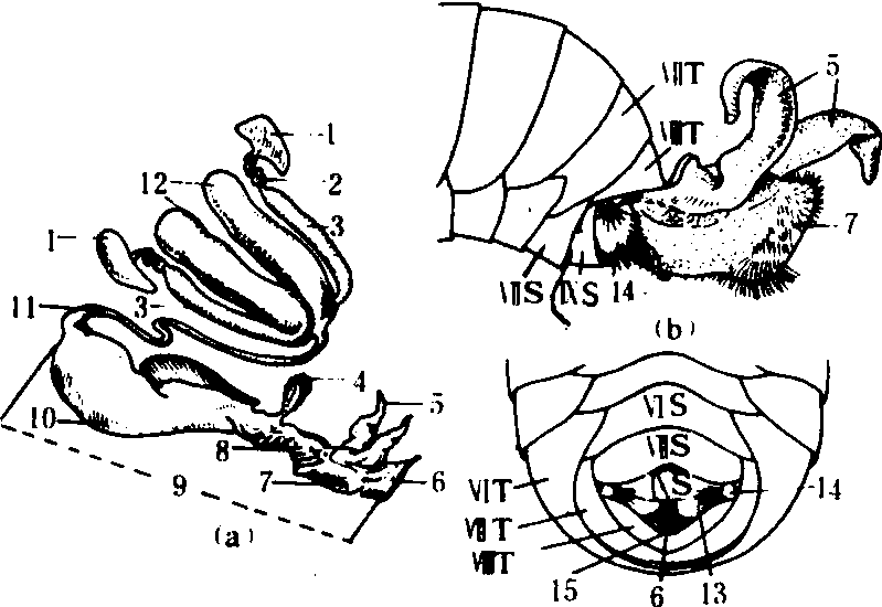 图2 雌蜂生殖器官 蜂王的卵巢中,每条卵巢管内都有原始雌性生殖细胞,卵原细胞。这些细胞在管内向下移动过程中,增殖和分化成个体较大的卵母细胞,然后成为卵子和另一种较小的滋卵细胞。较老的卵子,每个都伴随着一团滋卵细胞,体积逐渐增大。剖开卵巢管,就可看到一连串交替间隔着的卵室和滋卵细胞室。在卵巢管下端,成熟的卵将全部滋卵细胞吸收,并由卵室壁(卵泡囊)分泌一个卵壳,将卵包裹。 成熟的卵通过侧输卵管、中输卵管到达生殖道(阴道)。阴道与受精囊相连,受精囊贮存着与雄蜂交配时得到的精子。卵的前端有一个接纳精子的微孔,即卵孔。在卵到达阴道时,蜂王借助某种调节机制,把精子排在一些卵上,使卵受精;对另一些卵则不排精子。产到巢房里的蜜蜂的卵,不论受精与否,都能发育成长。 生殖系统reproductive system具有种的延续功能的器官系统。昆虫的生殖系统,由产生、维护及输送生殖细胞的生殖器官和交配、授精、产卵用的外生殖器组成。