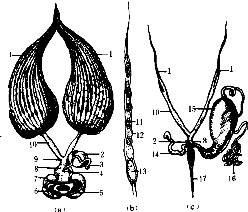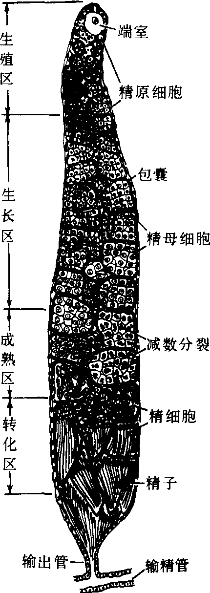 (仿H. Weber) 睾丸 位于昆虫腹部背面,各由数条睾丸管组成。睾丸管一般较同种昆虫的卵巢管少,鞘翅目肉食亚目只有1条,虱目2条,鳞翅目4条,蝗科约100条。较高等昆虫的睾丸包在一层围膜内,有些昆虫则一对睾丸包在共同的围膜内(如蝗虫、蝼蛄、蝶类等)。每条睾丸管基部有一短小的输精小管与输精管相通,管壁为一层有细胞结构的围鞘,用以从血淋巴中吸收营养物质供生殖细胞发育用。睾丸管(图4)按生殖细胞发育程度分成4个区域:顶部为生殖区,内有精原细胞及一个大型端细胞(端室),端细胞以原生质丝与精原细胞相连并为后者提供营养;生殖区下为生长区,精原细胞形成圆形的胞囊并在其内经过6~8次分裂成64~256个精母细胞;成熟区位于生长区之下,精母细胞在此进行两次成熟分裂,每个精母细胞分裂成4个精细胞,多数昆虫第一次分裂为减数分裂,染色体数目减半;睾丸管最下端为转化区(又称变态区),胞囊中的圆形精细胞在此转变成线形、具鞭毛的精子,最后胞囊壁溶化,精子仍成束地聚在一起。