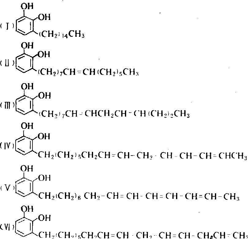 生漆曲线切割口型图 ❶选树干平凹的一面为割面,第一个割口距树干基部30厘米左右,往上每个割口的距离为60厘米左右; ❷用刮刀刮去割口部位的粗皮; ❸在割口中间保留1.5~2厘米宽的营养带; ❹割口左右上下共4刀,第一遍刀切成45°的斜线,每个割口最长不得超过树围的1/3,共割10轮刀,深度以割到形成层为宜,宽度一般控制在3毫米以内; ❺在割口下方正中安放受漆器。 质量标准 1984年中国国家标准局制定了生漆标准,详见GB4384-84。 化学成分 含漆酚60~80%,漆酶10%以下,树胶质3~6%,含氮物质1~3%,水分10~30%,其他有机物质少量。 漆酚是生漆的主要成分,具有不同饱和程度的长侧链的邻苯二酚衍生物的混合物,是漆液涂布后的成膜物质,由饱和漆酚(Ⅰ)、单烯漆酚(Ⅱ)、隔离双烯漆酚(Ⅲ)、共轭三烯漆酚(Ⅳ)、双共轭三烯漆酚(Ⅴ),末端双键漆酚(Ⅵ)组成。饱和漆酚为固体,熔点58~59℃,约占漆酚总量的10%;单烯、双烯、三烯漆酚均为液体,三烯漆酚是漆酚的主要组成部分,占漆酚总量的50%以上。漆酚对漆液的干燥和成膜性能有重要的影响。