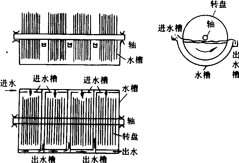 图2 塔式生物滤池示意 转盘式生物滤池 简称生物转盘。工作机构是一系列平行排列的圆盘,两片之间留有空隙,并固定在同一横轴上。圆盘一半浸没在污水中,用小功率电动机,通过减速齿轮使其低速旋转。圆盘是用轻质耐腐蚀、坚固而不易挠折的材料,如泡沫聚氯乙烯、泡沫聚苯乙烯、玻璃钢等制成。圆盘表面覆盖硝化菌为主的生物膜,作用与滤料相似。当污水流过圆盘时,生物膜吸附并吸着污水中的胶态和可溶性有机物,加以分解,使微生物获得营养。当转出水面时,生物膜又从大气中直接吸收氧气。如此循环反复,污水中的有机物不断氧化分解,圆盘上老化的生物膜脱落,随水流出,在二次沉淀池中沉淀下来。由于这种装置采用密排的平行圆盘,具有较大的生物活性表面积,从而保证滤池中污水得到充分搅拌和充气,在处理高浓度污水时不会发生堵塞现象。生物转盘结构简单,运行方便,维修费用低,不需回冲清洗,可连续使用,占地面积小(图3)。
