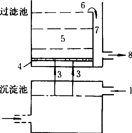 图1 浸没式生物滤池示意 1.流水池排水;2.外水源;3.动力抽水;4.散氧管;5.滤料层;6.滤池出水;7.滤池出水槽;8.流水池进水 塔式生物滤池 简称塔滤。塔高5~6米。塔中充满花岗岩、火山熔岩、黄铁矿石,或多孔塑料环等作为滤料。原理同前一滤池,养鱼污水先经预处理,除去固体污物,然后用泵输入淋水塔,在塔上部用旋转喷水器将水喷洒均匀,污水在向下流动过程中,可溶性污物挂在滤料上,被生物膜分解成硝酸盐等简单化合物。经过淋水塔净化的水再经沉淀池沉淀2~3小时,即可供应用。这种构筑物内部通风良好,水流紊动剧烈,水力冲刷较强。因此,污水同空气和生物膜接触充分,生物膜更新速度快,各层生长有适应于污水性质不同的生物群,有利于有机物的生物降解。塔滤负荷较高,占地少,对冲击负荷有较强的适应性(图2)。