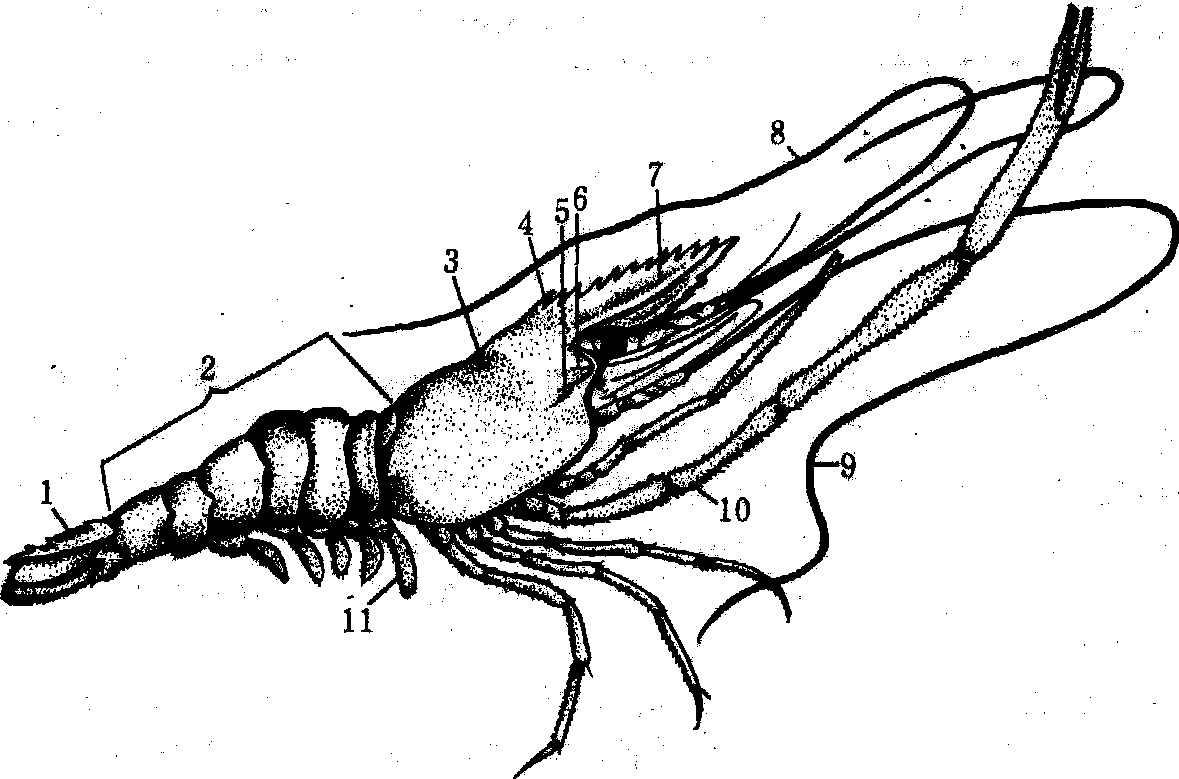 1.尾刺; 2. 腹部; 3. 头胸甲; 4. 胃上刺; 5. 肝刺; 6. 触角刺7. 额剑; 8. 小触角; 9. 大触角; 10. 步足; 11. 游泳足