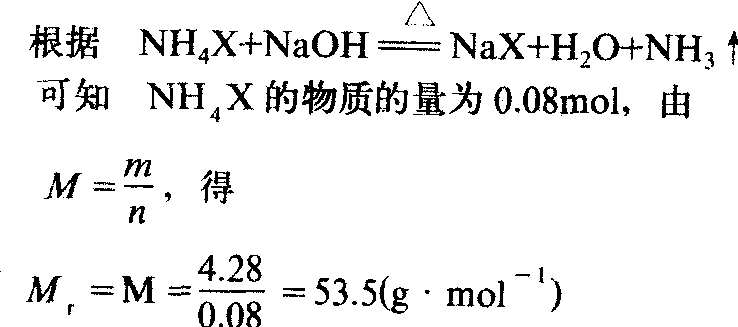 ❷求X的相对原子质量根据分子式 NH4X 14+1×4+Ar=53.5 Ar=35.5 答 铵盐的相对分子质量为53.5,X的相对原子质量为35.5。 |