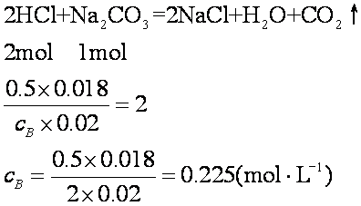 例1 在锥形瓶中注入20mL Na2CO3溶液,用0.5mol·L-1盐酸进行滴定,完全反应用去盐酸18mL,计算Na2CO3溶液的摩尔浓度。 解 设Na2CO3溶液的摩尔浓度是cB。根据化学方程式,完全反应时,HCl和Na2CO3的物质的量之比是2/1=2。