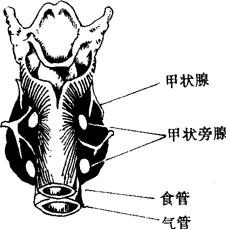 | 释义 | 甲状旁腺jiazhuangpangxian人体内分泌腺之一。人体有两对甲状旁腺,棕黄色,形似大豆,分别位于左右两叶甲状腺背面(或埋在其中)的中部和下部。主要功能为分泌甲状旁腺激素(简称PTH),调节机体内钙、磷的代谢。甲状旁腺功能低下或彻底摘除(如甲状腺手术切除时不慎误摘),则PTH分泌不足,使血钙渐渐下降,而血磷渐渐上升,导致低血钙性搐搦,甚至死亡,补给PTH和钙盐可使症状暂时缓解。而当甲状旁腺机能亢进,PTH分泌过多时,则使骨钙进入血液,并加强肾脏对钙的重吸收,同时激活维生素D3成为活性D3,促进小肠对钙的吸收,使血钙过高,并抑制肾脏对磷酸盐的重吸收,促进尿中磷的排出,使血磷过低,从而导致钙盐在一些组织中的异常沉积,使组织发生病理性钙化,并可能形成肾结石。又由于骨钙减少,易引起骨折。PTH的分泌主要受血钙浓度的调节,血钙高时,PTH分泌减少,血钙低时,PTH分泌增加。血钙每变化1mg/dl,PTH浓度约变化100%,长期血钙过高或过低会导致甲状旁腺腺体缩小或加大(可大至5倍以上)。机体内钙磷代谢还受维生素D和降钙素的影响。降钙素由甲状腺内的腺泡旁细胞分泌,具有与PTH相反的作用。 甲状旁腺parathyroid gland位于甲状腺近旁,由第3、4对鳃囊发生的内分泌腺。最早见于两栖类。数目和位置在各种动物中变化较大,一般为一对或两对。有的离甲状腺较远,有的埋于甲状腺或胸腺内。在哺乳动物,甲状旁腺为扁圆形小体,表面被有薄的被膜,腺细胞排列成索或团,其间有少量结缔组织和丰富的毛细血管。细胞分为主细胞和嗜酸性细胞。主细胞占大多数,呈圆形或多边形,核圆形,位于细胞中央。根据胞质染色的深浅,又分为明主细胞和暗主细胞,两者是同一种细胞的不同功能状态; 胞质内有分泌颗粒,含甲状旁腺素(见激素),主要参与维持血钙的恒定。嗜酸性细胞见于马、牛、猴等动物,数量少,但随年龄而增多。单个或成群分布。比主细胞大,核小而圆,染色深,胞质内充满嗜酸性颗粒,功能尚不清楚。 甲状旁腺jiazhuangpangxian内分泌腺之一。一般为四个棕黄色圆形小腺体,位于甲状腺背面上下两端(见图),或埋在甲状腺组织内。甲状旁腺总重量约0.1克,分泌甲状旁腺激素,主要功能是调节人体内钙、磷的代谢,它和维生素D、降钙素等物质共同调节与控制人体血液和骨骼里钙、磷成分。