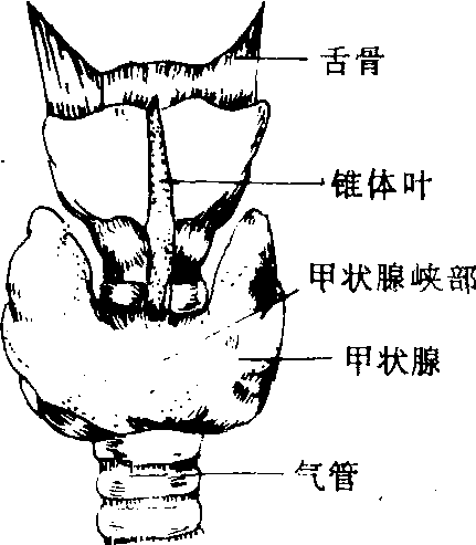 哺乳动物甲状腺的组织结构 腺表面包有薄的结缔组织被膜,内部实质被富有血管的结缔组织分为许多境界不明显的小叶,小叶由密集分布的甲状腺滤泡组成。滤泡直径0.02~0.9mm,呈球形,椭圆形或不规则形。其形状和大小可因性别,营养状态,年龄以及食物中的含碘量等而变化。滤泡由单层上皮细胞围成,腔内充满胶质,是滤泡上皮细胞的分泌物,主要成分为甲状腺球蛋白。上皮细胞为立方形,细胞高低随机能而变,游离面有少量微绒毛,核圆形位于细胞中央,胞质内有较发达的粗面内质网和散在的线粒体,核上部有高尔基复合体,细胞顶部有分泌颗粒和胶质小泡以及一些溶酶体等。滤泡腔内的甲状腺球蛋白与碘结合成碘化的甲状腺球蛋白,被滤泡上皮重吸收后,与溶酶体融合,蛋白水解酶将其分解为甲状腺素,释放入毛细血管。在滤泡上皮细胞间或滤泡外的结缔组织中。还散在有一种细胞,为滤泡旁细胞,又称C细胞,细胞顶端常被滤泡上皮细胞覆盖,细胞基底部有许多嗜银性的分泌颗粒,分泌物为降钙素(见激素)。在低等脊椎动物滤泡旁细胞则组成独立的后鳃体。 甲状腺jiazhuangxian人体最大的内分泌腺。甲状腺(见图)约重20~30克,位于气管上端甲状软骨两侧,分左右两叶,呈“H”形,中间较狭窄的部分为峡部。小儿出生时,甲状腺已形成,以后逐渐生长,至青春期发育最快,机能也达最高峰。甲状腺主要分泌甲状腺激素,这种激素的主要作用是调节新陈代谢,兴奋神经系统,促进骨的生长发育。碘是甲状腺制造甲状腺素的主要原料,碘摄取量不足,可导致甲状腺功能不足,甲状腺因代偿作用而增大,成为甲状腺肿。青春发育期的青少年,由于全身新陈代谢旺盛,需要甲状腺激素的量增大,对碘的需求量也增大,有时会发生一时性碘供应不足,引起甲状腺肿大,称作青春期甲状腺肿。过了青春发育期或补充碘以后会好转。在甲状腺肿流行地区,因孕妇饮食中缺少碘,不能供给胎儿足够的碘,致使胎儿甲状腺激素的合成受到影响,进而影响胎儿中枢神经系统的发育,尤其是大脑的发育,这种因先天性甲状腺功能低下引起的疾病叫克汀病,又称呆小症。若甲状腺激素分泌过多,人体会出现新陈代谢过于旺盛的现象,表现为吃得多,消瘦,心跳加快,大量出汗,眼球突出等症状,称为突眼性甲状腺肿。另外,甲状腺还能分泌一种叫降钙素的激素,具有调节钙、磷代谢的作用。