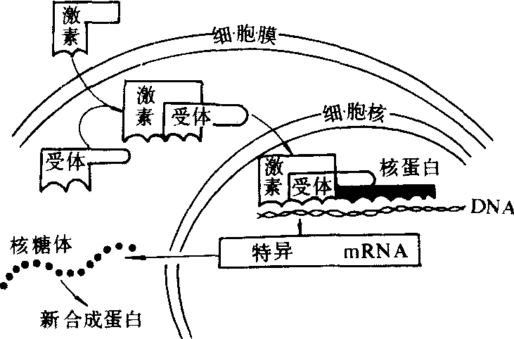 图1—22 类固醇激素作用原理 甲状腺thyroid gland动物体内主要分泌甲状腺素的内分泌器官。在高等脊椎动物常分成两叶,居于气管两侧,外有结缔组织被膜,腺实质有许多由单层上皮围成的甲状腺滤泡。滤泡呈圆形或不规则形,大小不等,滤泡内含嗜酸性的胶质,滤泡间有少量结缔组织和丰富的毛细血管分布。滤泡上皮呈立方形,核圆位于细胞中央,能合成甲状腺素。在哺乳类,滤泡上皮之间及滤泡之间另有色淡而较大的滤泡旁细胞,亦称亮细胞或C细胞,单个或成群分布,分泌降钙素。在低等脊椎动物,甲状腺可以滤泡形式分散存在于其他器官内,不成独立器官。 甲状腺呈H形,分为左、右两个侧叶,中间以峡部相连。侧叶贴于喉下部和气管上部的两侧,上达甲状软骨中部,下抵第6气管软骨环。峡部一般位于第2~4气管软骨环的前方。 |