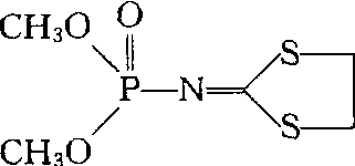 | 释义 | 甲-环胺磷America cyanamid43064,cyolane又称甲-棉安磷。高毒有机磷杀虫、杀螨剂。化学名称:O,O-二甲基磷酰亚胺基-1,3-二硫戊环。化学结构式如下。工业原药为淡黄色油状液体。密度(d204) 1.39、蒸气压100~ 105℃/0.133 Pa。易溶于水及丙酮、苯、乙醇等溶剂。遇碱易分解,光和高温加速分解。使用35%乳油1 kg加水50 kg拌麦种500 kg,防治地下害虫。35%乳油1 kg加水15 kg拌35 kg棉籽,防治棉蚜及地下害虫。急性口服LD50大鼠(♀)为27~ 50 mg/kg、小鼠LD50 (♂)为72~79 mg/kg、大鼠无作用剂量为0.46 mg/(kg·d)。