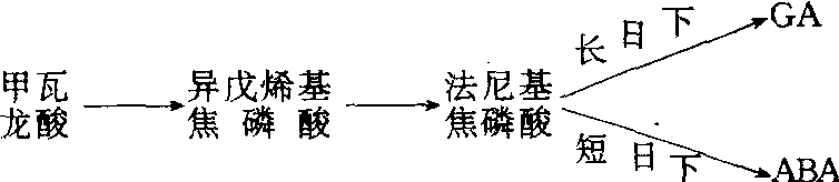 | 释义 | 甲瓦龙酸mevalonic acid又称甲羟戊酸。赤霉素和脱落酸生物合成过程中的共同前身物。结构式如下。它由3分子乙酰辅酶A缩合而成。甲瓦龙酸经异戊烯基焦磷酸、法尼基焦磷酸,最后形成赤霉素或脱落酸。日照条件可调控GA和ABA的形成。长日照有利于GA的合成,而ABA则需要短日照。GA和ABA生物合成的关系如下所示:
