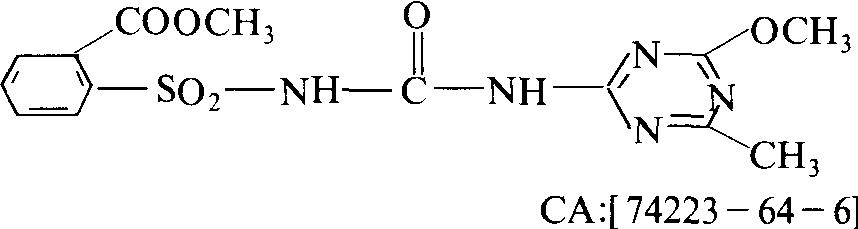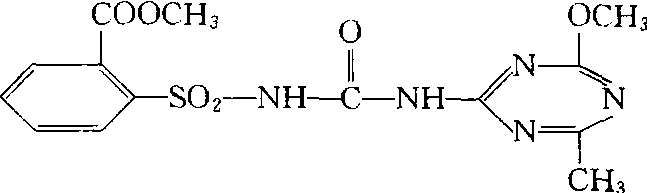 性能 原药为白色、无味固体,熔点163~166℃,蒸气压7.73×10-3帕/25℃。水溶度因pH而异:pH4.59时为 270,pH 5.42 时1 750,pH 6.11为时9 500毫克/升。对温血动物的毒性很低,大鼠口服LD50>5000毫克/千克,对水生动物毒性低。加工剂型为干燥胶悬剂或可湿性粉剂。 作用机制 作用机制与氯磺隆近似,通过植物的根茎叶吸收,在体内迅速传导,抑制乙酰乳酸合成酶(ALS)活性,导致缬氨酸与异亮氨酸生物合成受阻,从而造成生长受抑制而死亡。抗性作物小麦吸收后,在体内进行苯环羟基化作用,此羟基化产物迅速与葡萄糖形成轭合物,从而丧失活性。 在土壤中的降解 甲磺隆在土壤中通过水解与微生物降解而消失,半衰期4周,在酸性土由于水解迅速,故分解略快; 它在土壤中的持效期比氯磺隆短,每公顷用有效量2和8克,施药后经7和44周已测不出残留量,故对后茬作物的安全性比氯磺隆高。 应用 甲磺隆是现有磺酰脲除草剂中活性最高的品种。适用于各类土壤,进行苗前土壤处理或苗后茎叶喷雾,主要防治麦田大多数阔叶杂草,对禾本科杂草也有显著抑制作用。干旱条件下进行土壤处理时,喷药后浅混土可提高防治禾本科杂草的效果。由于甲磺隆对猪殃殃、看麦娘、早熟禾等活性较差,故配制出了与氯磺隆的混合制剂Finesse。其对后作的影响及应用技术尚在研究中。 甲磺隆methsulfuronmethyl代号DPX-T6376。磺酰脲类除草剂。化学名称:2-〔3(4-甲氧基-6-甲基-1,3,5-三嗪-2-基)脲基磺酰基〕苯甲酸甲酯。化学结构式如下。原药为白色结晶固体,熔点163~166℃,25℃时蒸气压773.3×10-5Pa。微溶于水,并随pH值升高而溶解度提高。可溶于多种有机溶剂。超高效内吸除草剂,可被植物的叶和根吸收,并迅速向基部和顶部传导,积累于根和茎的顶端,抑制体内氨基酸的合成,及生长点细胞的分裂和生长,使生长点坏死,停止生长而死亡。用于小麦播前、播后芽前及麦苗一、二叶期使用,防除看麦娘、早熟禾、黑麦草、婆婆纳及堇菜属、蓼属的杂草。用量(a、i)4~8 g/hm2。对人、畜低毒,大鼠急性口服LD20>5 000 mg/kg,兔经皮急性LD50>2 000 mg/kg。对眼有刺激,对鱼低毒。在碱性土壤中残留期较长,超量使用可能对麦苗及后茬作物造成药害。