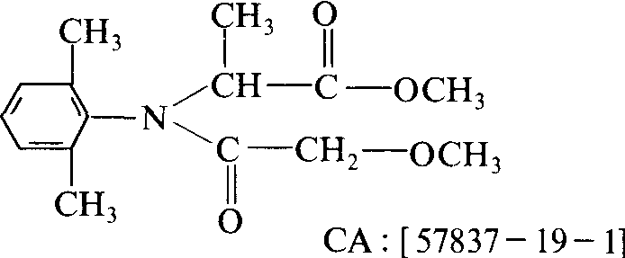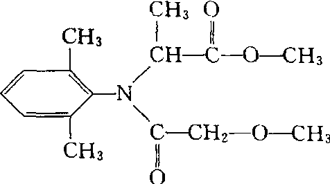 性能 纯品为白色结晶,熔点71.8~72.3℃,密度(20℃)1.21,20℃时蒸气压为293.31×10-6帕。20℃时在各种溶剂中的溶解度: 水0.71%、己烷0.91%、甲醇65%、苯55%。在中性或酸性介质中稳定。高温(300℃)稳定。含量90%的原粉常温贮存稳定期达两年以上。对温血动物低毒,原药大鼠急性口服LD50为669毫克/千克,急性经皮LD50 > 3100毫克/千克,对兔皮肤和眼有轻微刺激作用。不致畸,无致突变作用,三代繁殖试验未见异常,两年喂饲试验,大鼠无作用剂量为50毫克/千克。对鱼、鸟和蜜蜂低毒,对虹鳟鱼、鲤鱼96小时LC50为100毫克/升,对蜜蜂LD50为20微克/只,对鹌鹑LD50为798~1067毫克/千克。对藻菌纲真菌,尤其是其中的卵菌具有优良的生物活性。它具有药效高、内吸性强、双向传导(向顶性和向基性)、残效期比较长、兼有保护和治疗作用、用药方法多样等特点。 应用 主要用于防治蔬菜、果树、经济作物和禾谷类作物由藻菌纲真菌引起的病害,对疫霉属所致马铃薯晚疫病、番茄疫病、烟草黑胫病; 假霜霉属引起的黄瓜和啤酒花霜霉病; 单轴霉属所致葡萄霜霉病;指梗霉属引起的谷子白发病; 霜霉属引起的烟草和洋葱霜霉病; 以及由腐霉属引起的各种猝倒病及种腐病等20多种病害,都具有良好防治效果。保护喷洒使用浓度为250~350毫克/升(有效成分),治疗喷洒使用浓度为350~500毫克/升,防病效果一般为80~98%。残效期为10~15天。在黄瓜、葡萄、烟草和啤酒花上,也可采用颗粒剂穴施。防治谷子白发病则采用35%粉剂或可湿性粉剂拌种,制剂用量为种子量的0.2~0.3%。以颗粒剂或灌根施用,有效期可稳定在30天以上。在有效剂量下,对作物无药害。单独使用易使病原菌产生抗药性,加工制剂有25%和35%可湿性粉剂、35%粉剂、5%颗粒剂、58%甲霜灵锰锌混剂(10%甲霜灵+48%代森锰锌)及其他一些混剂等。这些混剂可以降低用药成本和延缓抗药性生成。 甲霜灵metalaxyl又称瑞毒霉。乙酰丙氨酸类杀菌剂。化学名称:D,L-N-(2,6-二甲基苯基)-N-(2′-甲氧基乙酰)丙氨酸甲酯。化学结构式如下。原药淡褐色结晶,20℃时水中溶解度7.1g/L,在甲醇中溶解65%,溶于多种有机溶剂。1977年由瑞士汽巴一嘉基公司开发。选择性内吸杀菌剂,主要对腐霉菌、疫霉菌和霜霉菌有特效,种子处理、土壤浇灌、叶面喷洒都可,有较强的植物吸收和双向运转的功能,以向顶输导为主。残效期长,对由卵菌引起的多种作物病害具保护和治疗作用。为扩大防治范围,可与其他保护剂如代森锰锌、灭菌丹、硫酸铜等制成混剂。对植物安全,对大鼠急性口服LD50669 mg/kg,经皮LD50>3 100 mg/kg,对野生动物和鱼类毒性极小。