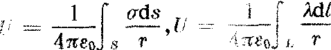同理,由电势迭加原理可求得面电荷分布、线电荷分布的电势公式分别为