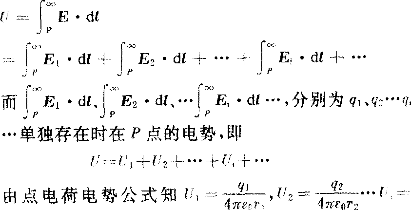 | 释义 | 电势叠加原理dianshi diejia yuanli带电体系静电场中一点的电势等于每一点电荷单独存在时在该点的电势的代数和。电势迭加原理是场的迭加原理的必然结果。设空间有q1、q2…qn个点电荷,它们在场点的场强分别为E1、E2、…En,按场的迭加原理总场强E=E1+E2+…En。场点P的电势为