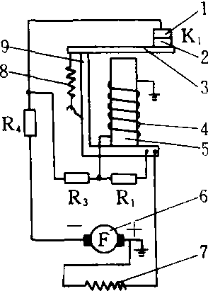 电压调节器示意图 1.固定触点 2.动触点 3.触点臂 4. 电压线圈 5.铁芯 6.发电机 7.激磁线圈 8.弹簧 9.框架 R1—附加电阻(80Ω) R3—助振电阻(13Ω) R4—平衡电阻(1Ω) |