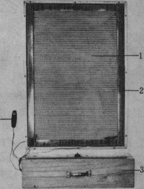 图1 手控电取蜂毒器 电取蜂毒器主要由电网框、取毒托盘、供电装置组成。电网框架为木质或塑料,尺寸大小不一,框架上装有许多平行的不锈钢丝或镀镍金属丝或镀镍塑料丝制成电网,间距约6毫米。取毒托盘系木质,内置电网框架、尼龙布和平板玻璃,平板玻璃与电网间隙一两毫米。一种是手控供电装置,采用可调直流电源,在输出端安装一电源开关。取毒时根据需要调节电压,一般在15~25伏之间,用电源开关控制电网电流接通或断开;接通10~15秒,断开10秒左右(图1)。还有一种电取蜂毒器采用电子自控装置,由振荡器产生低频振荡,频率可根据需要调节,振荡信号在电子开关或继电器上,控制电网电路接通或断开。(图2)