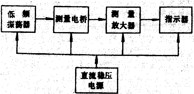 专用电子仪器 为适应专业需要而设计的测试仪器。如用于粮食贮藏部门的粮食湿度测量仪(图2),由低频振荡器、测量电桥、测量放大器、指示器和电源组成。振荡器产生频率为1400赫,输出电压的峰值可达10伏的低频正弦波信号。测量电桥由传感器、电容器、电阻和电位器组成。当振荡器输出电压一定时,调节电位器和可变电容器,可使电桥达到平衡状态。电桥的不平衡输出信号能线性地反映粮食的湿度。电桥的不平衡输出经测量放大器放大后,由指示器直接读出粮食湿度。