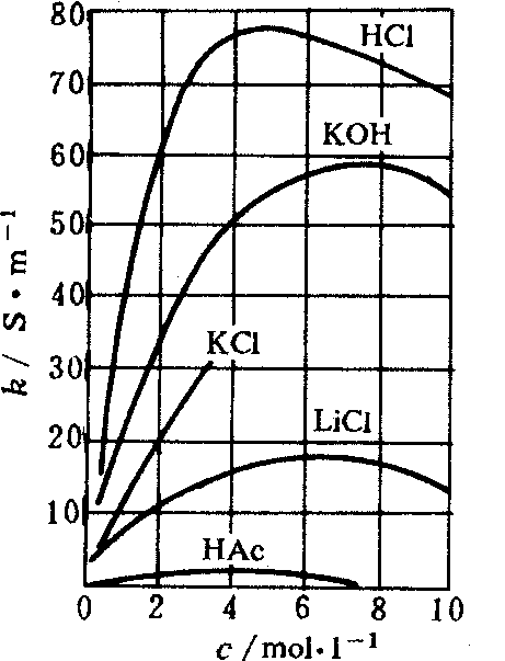 式中G为电导,A为横截面积,l为长度,к为比例系数,是单位长度、单位横截面积物体的电导,称为电导率,单位为S·m-1。它是个真正反映物体导电能力的物理量。电导率可直观地比较各种溶液的导电能力,不用考虑电极面积和电极间的距离等。例如,5%NH4Cl 溶液 k=9.180,10%NH4Cl 溶液k=17.78S·m-1,因此后者导电性比前者好。而电导G的数值不仅与浓度有关,还与电极面积、电极间距离等因素有关,因此不能简单地用电导值比较导电能力的强弱。 电解质溶液的电导率与溶液的浓度有关,如下图所示。对强电解质而言,浓度较小时,电导率随浓度增加很快增大,这是由于浓度增大,离子数目增多之故。当浓度增大到某一数值后,电导率反而减小,这是由于溶液中离子数目相当大,正、负离子间引力加大,使离子的迁移速度减慢,导致离子导电能力降低。对弱电解质而言,浓度加大时电离度减小,离子数增加得并不显著,因此电导率随浓度的变化