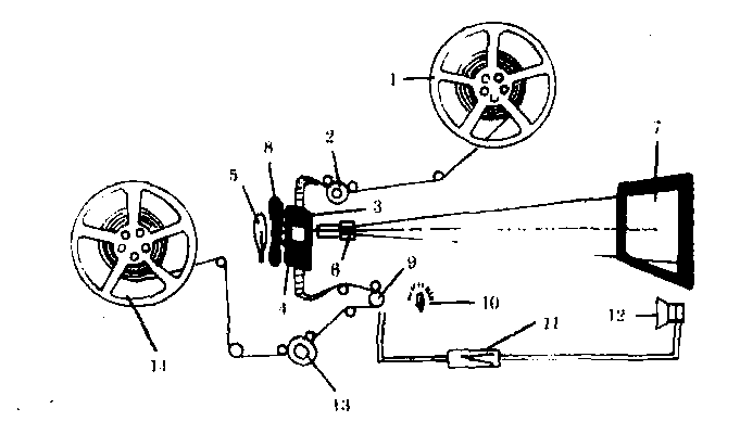 1. 供片夹 2. 输片齿轮 3. 片门 4. 抓片齿 5. 光源 6. 放映镜头 7. 银幕 8. 遮光器 9. 音鼓 10. 激励灯 11.扩音机 12.扬声器13. 收片齿轮 14. 收片夹 |