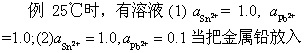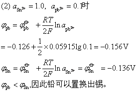 解 查得 =-0.136V; =-0.126V(1) Pb2+,Sn2+活度均为1.0时, ![]() 所以铅不能置换出锡。