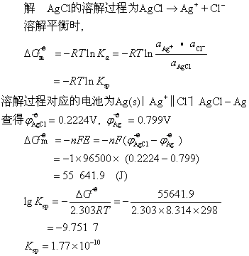 ❸求难溶盐的活度积 把难溶盐的溶解过程设计成一个电池,便可由电池的电动势求难溶盐的活度积。 例 求AgCl的活度积Ksp。