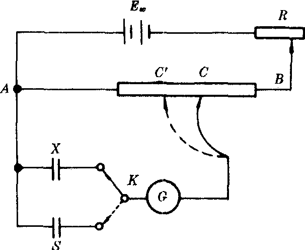 对消法测电动势 降,其值由滑动点C的位置确定。当滑动点移至某点C时,检流计中电流为零,则标准电池电动势与AC段的电势降等值反向。使K与X相通,移动滑动点的位置至C′时,检流计中无电流通过,则待测电池的电动势与AC′段的电势降相等,由此可得: