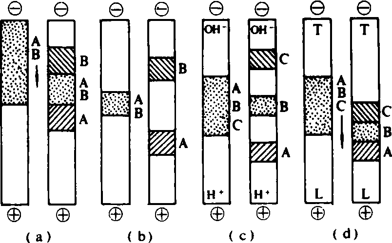 式中d为移动距离,t是时间。在确定的条件下,某种离子的迁移率为常数,是该粒子的物化特征性常数。对于处于离解平衡的体系,粒子的有效迁移率为μα,α为离解度。不同的有效迁移率有不同的泳动速度,利用这一效应可把不同的粒子彼此分离,并定性和定量。 根据分离的原理不同,电泳分析可分为4类(见图):❶移界电泳。即样品与载体电解质在电泳开始前有清晰的界面,电泳过程中,不同成分泳动的速度不同,因而先后形成不同的界面[图中(a)]。 ❷区带电泳。将样品加在置于均一载体电解质中支持物的中部位置,样品中带正或负电荷的粒子分别向负或正极以不同的速度移动,分离成区带[图中(b)]。 ❸等电聚焦。在分离室中置一pH值梯度缓冲液,pH值从分离室 一端向另一端递增。在电场中,被分离物质各自向其等电点位置聚焦。区带不扩散,越走越窄,分辨力极高[图中(c)]。 ❹等速电泳。在两个电极室中分别含有与被分离离子符号相同的先行离子(迁移率最大)和终止离子(迁移率最小),样品置于中间。电泳达平衡后,各离子区带按迁移率大小顺序先后排列,并保持一定的浓度比等速前进[图中(d)]。