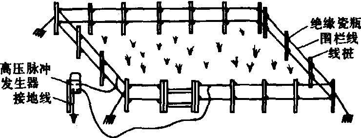 电牧栏结构示意 高压脉冲发生器的种类较多,早期有摆盘式、点火线圈式、振子式等。20世纪90年代已为晶体管和可控硅脉冲发生器所代替,利用可控硅交替地导通与关断,使高压变压器次级线圈上产生所需的高压脉冲电压。围栏线采用直径为4~5毫米的镀锌铁线,架设在瓷瓶上。线桩可用角钢、木材或钢筋混凝土等材料制成,长1~2米,埋深为桩长的1/3,桩间距离15~25米。绝缘瓷瓶可选用3千伏架空线用瓷瓶。围栏线的列数和高度由所围牲畜种类而定,一般上层线高度约为牲畜体高的2/3~3/4,下层线高度约为牲畜体高的1/3~1/2。牛、马群架双列,上层线高1米,下层线高0.5米;绵羊群架双列,上层线高0.8米,下层线高0.4米;山羊群架三列,第一列高0.8米,第二列高0.5米,第三列高0.25米;猪群架双列,上层高0.5米,下层高0.25米。围栏所圈形状为长方形,长宽比为2:1、3:1或5:1。 |