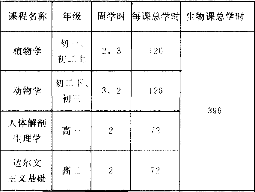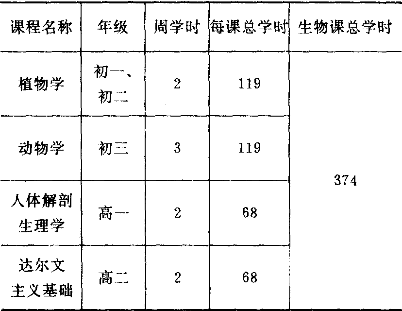 (2) 1952~1957:1952年10 月,教育部颁布了我国解放后的第一个《中学生物学教学大纲(草案)》,对中学生物课的教学目的要求、教学内容和教学方法都作了明确的规定。1952年,人民教育出版社陆续出版了方宗熙等根据苏联编译本改编成的中学生物学的4种课本。1954年7月20日,教育部又颁发了《精简中学生物教学大纲(草案)和课本》的指示,删去了“超越基本科学知识范围的和次要的教材”和“不符合学生年龄特征的艰深教材”,以及课本中的“一些教学大纲(草案)没有列入的内容”,以减轻学生的负担。1956年6月,为了进一步贯彻全面发展的教育方针,实施基本生产技术教育,又颁发了《中学生物学教学大纲(修订草案)》和《中学生物实验园地实习教学大纲(草案)》,两者横向配合,以便对学生进行生物学和基本生产技术教育。对课程及学时作了如下改动: