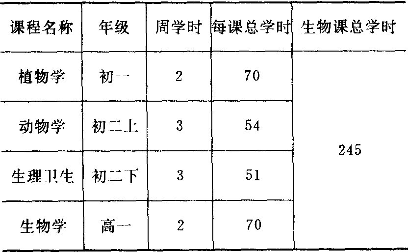 中学生物教学是随着社会政治、经济及生物科学的发展而发展的。在我国,生物学作为中学教学计划中的一个学科,已有100多年的历史。大体上可分为中华人民共和国建立前和建立后两大阶段。建立前(1840~1949)又可分为(1)1840~1900:鸦片战争后,我国逐渐开展了系统的科学教育,生物学课程主要在教会学校开设,教学基本上由外国传教士进行,教学内容带有浓厚的宗教色彩。(2) 1901~1912:1902年和1903年(清光绪二十八年和二十九年),清政府先后颁布了“壬寅学制”和“癸卯学制”,制定了《奏定中学堂章程》,规定中学学制5年,有4年开设博物课,其中一、二年级开植物和动物,三、四年级开生理、卫生和矿物,每周均为2课时。教学内容以形态、构造、分类为主,也强调生理功能及生物之间的相互关系,并且注重生物知识的实际应用。在教学方法上要求重视实物标本的观察,规定了生物教学必须具备实验室和标本室。(3) 1912~1922:1912年(中华民国元年)12月,南京临时政府教育部公布了《中学校令实施规则》,规定中学学制4年,博物课开设3年,一、二年级开植物、动物,每周3课时;三年级开生理、卫生和矿物,每周2课时。对教学目的要求规定为:“博物要旨在习得天然物之知识,领悟其中相互关系及对人生之关系。”1913年公布的课程标准中规定:植物、动物的内容包括形态、分类、解剖、生理、生态、分布、应用等之大要。生理及卫生包括人身之构造、个人卫生和公众卫生。(4) 1923~1949:1923年,中学学制改为6年,实行学分制,规定每半年上课1小时为1学分。初中设自然科(15学分)和生理卫生(4学分),不单设动、植物学,高中开设生物学(8学分)。1932年后,初中生物又分为动物、植物和卫生,分别为4、4、6学分,高中生物10学分,在高中一年级开设。1923年后,我国老一辈生物学家和生物教师,根据当时颁布的《高中生物学课程标准》,相继编写出版了多种生物学教科书,如吴元涤编著的《生物学》(1932年);陈桢编著的《复兴高级中学生物学》(1933年);郑勉编著的《高中生物学》(1935年);贾祖璋编著的《开明新编高中生物学》(1948年)等。其中以陈桢的高中生物学教科书影响最大,从1933年初版到中华人民共和国建立后的1951年7月,共发行181版次。上述教科书各具特色,一般都注意反映当时生物科学的新成就,介绍生物学家、生物学史以及不同的学术观点等,也重视基本实验方法的介绍,深入浅出,广泛联系实际。一些有名望的中学也陆续在高中开设生物实验,并有编印成册的实验指导。总的看来,中华人民共和国建立前的中学生物教学,主要效法西方和日本。中华人民共和国建立后(1949~ )又分(1) 1949~1952:先解放的东北地区,基本上学习苏联。当时东北人民政府教育部组织翻译了苏联中学的植物学、动物学、人体解剖生理学、达尔文主义基础等教科书,供各校采用。其他地区主要是修改解放前的一些教材,增加了米丘林学说的内容。1951年,教育部颁布了《中学暂行教学计划(草案)》,规定在中学开设4门生物课(见下表),从此,全国中学生物教学才由分散趋于集中统一。
