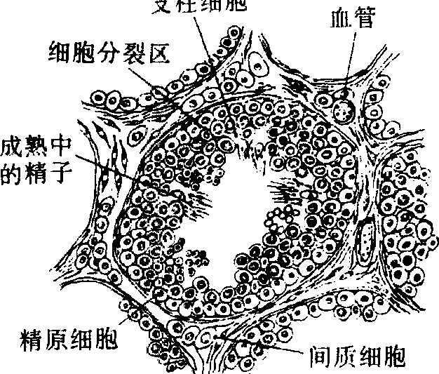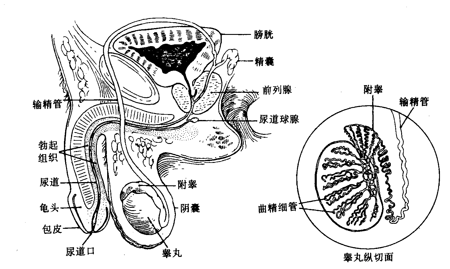 | 释义 | 男性生殖系统的构造与功能男性的生殖系统包括主性器官和副性器官(见图1.11-4)。主性器官为一对睾丸,它具有生成精子和分泌性激素双重功能。睾丸位于腹腔外阴囊内,阴囊内的温度较腹腔内低4℃,这是生成正常精子所必需的条件。副性器官包括附睾、精囊、前列腺、尿道球腺和阴茎等,它们的主要功能是为精子的成熟及生存提供一个适宜环境,并将精子送到女性生殖器官内。成人的睾丸约重20—40克,主要由几百条曲精细管组成(见图1.11-5),这是产生精子的部位,曲精细管之间有间质细胞,它们与附近的毛细血管和淋巴管密切接触,有分泌雄激素的功能。曲精细管由生精细胞和支柱细胞组成。最原始的生精细胞为精原细胞,精原细胞经过多次分裂和分化,最后发育成为精子。在人类,从精原细胞发育成为精子的过程需64天。支柱细胞具有支持和营养周围精细胞的作用,生精细胞是在支柱细胞的胞浆中而发育成熟的,精子形成后,支柱细胞即将它们释放到曲精细管的管腔中。支柱细胞紧贴管壁并相互紧密连接而构成血睾屏障,以监控进入曲精细管的物质而为生精过程保持一个适宜的微环境。睾丸分泌的雄激素以睾酮最多,作用也最强,睾酮除促进副性器官的生长发育和第二性征的出现外,还与生精过程有关。下丘脑分泌促性腺激素释放激素促进腺垂体分泌卵泡刺激素和黄体生成素。卵泡刺激素可促进生精过程,但精子的最后成熟还需有睾酮的作用,支柱细胞分泌睾酮结合蛋白,从而可使局部睾酮达到很高的浓度,黄体生成素主要刺激间质细胞分泌睾酮(因此黄体生成素又称间质细胞刺激素),睾酮可反馈性地抑制下丘脑和腺垂体的活动,这种功能联系称为下丘脑—腺垂体—睾丸轴。附睾为一条管腔粗细不等的导管盘曲而成,管上的平滑肌样细胞,有自发性节律收缩。曲精细管中的精子本身尚不具有活动能力,而是随着曲精细管内的液体流入附睾的。精子在附睾内一般停留12—21天,在停留的后半期内精子才达到完全成熟。输精管是从附睾尾到精囊颈部的一条长约25—45cm的输送管道,它含有很厚的平滑肌层,在性交时通过输精管的蠕动把精子送到尿道。前列腺为一个肌性腺器官,通过导管直接开口于上尿道。精囊为两个球状小囊,尿道球腺为位于尿道膜部两侧的一对小腺体,射精时这三种腺体的分泌物按顺序排出。精液中包括精子、精囊液、前列腺液和精液,精子所占的体积不到20%;精囊液占大约60%,为碱性较粘稠的液体,富含果糖,可营养精子和增强精子的活力;前列腺液约占20%,较稀薄,有一种特殊的气味;尿道球腺分泌粘液,起滑润作用。